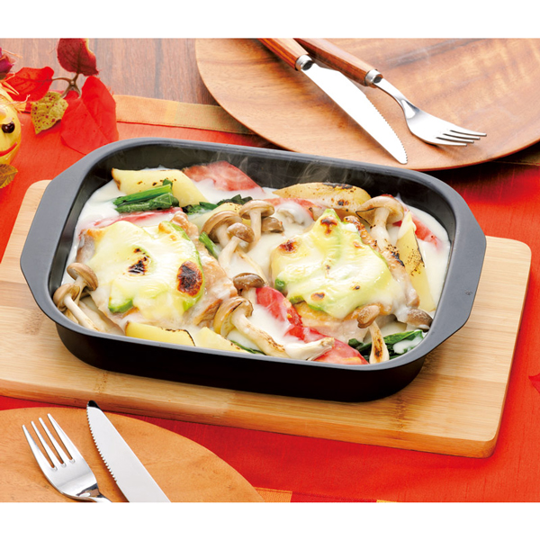 魚焼きグリルを小さなオーブンに変える便利な角型パン。蓋付きで蒸し焼きや本格調理が可能で、グリル庫内を汚さずスマートに使えます。料理の幅を広げたい方に最適で、実用性と上質さを兼ね備えた贈り物として喜ばれる一品です。