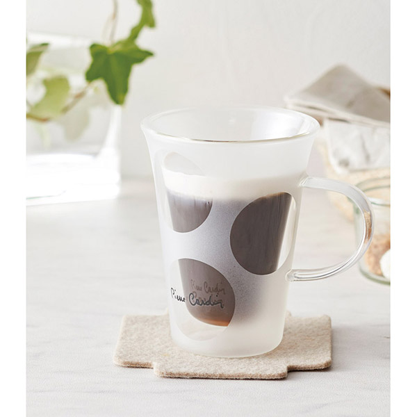 2重構造で保温・保冷効果が抜群です。コーヒーや紅茶、ジュースなど、ご自宅でティータイムを楽しむのにぴったり。外面にはブラストで表現した大きな水玉模様が入っていてキュート!電子レンジも使えて便利なガラスマグカップです。カルダン氏のサイン文字が入っています。