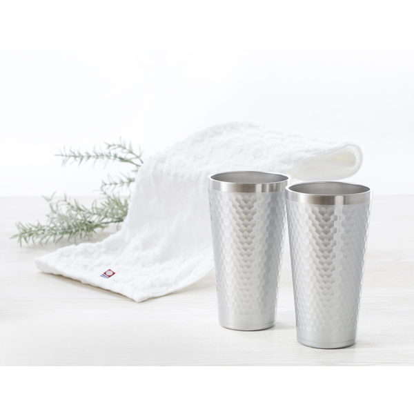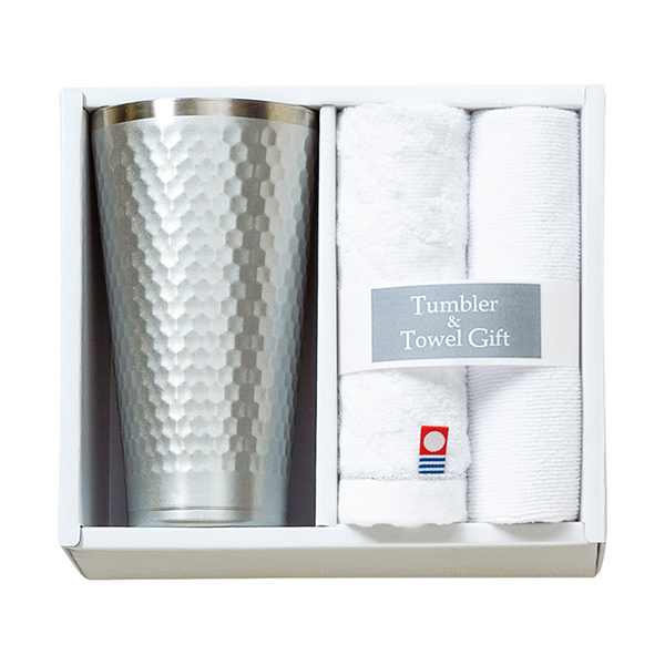 ステンレスの真空断熱二重構造で飲み頃の温度をキープするタンブラー。今治産タオルとマイクロファイバークロスのセットです。タンブラーは冷たいものを入れても結露せず、温かいものを入れても本体外側が熱くならないので一年中活躍してくれます。