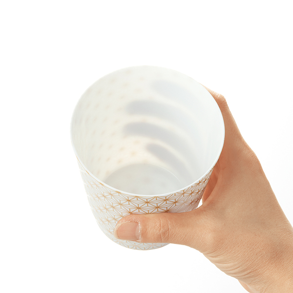 透き通るような薄い磁器の美しいフォルム。そこに浮かび上がる麻の葉文様が心地よく安らぎのひと時へ誘います。
