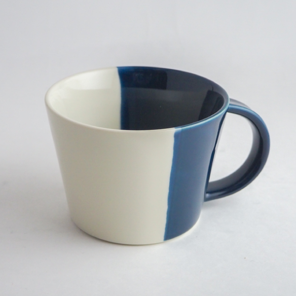「黄彩」と「ルリ」の2色のマグカップ。300mlと大容量ですが、軽量で持ち手も大きいので老若男女問わず喜んでいただけるマグカップです。