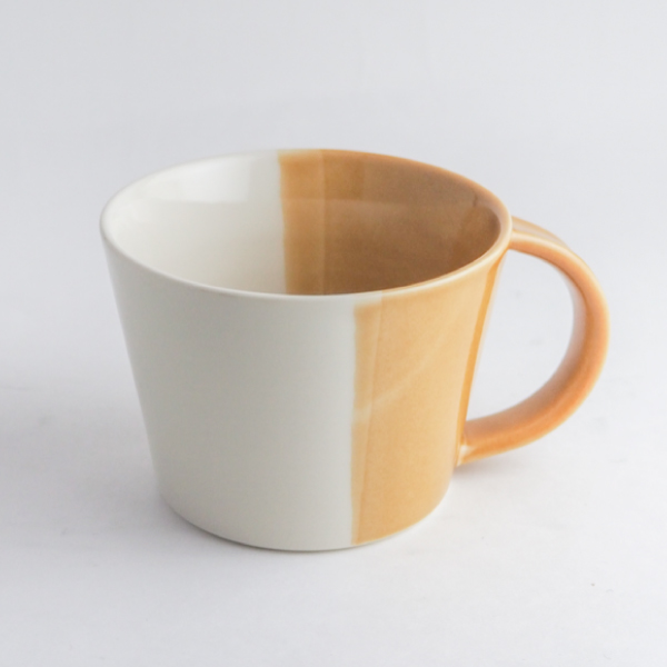 「黄彩」と「青磁」の2色のマグカップ。300mlと大容量ですが、軽量で持ち手も大きいので老若男女問わず喜んでいただけるマグカップです。