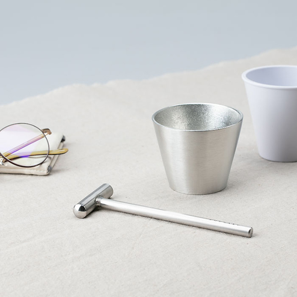 錫製タンブラーの内側にプラスチック製の製作用カップをセットし、タンブラーの底面を中心から外に向かって側面を底から飲み口に向かって叩いていくことで、オリジナル模様のタンブラーを作ることができます。100%の錫はやわらかく、力を入れずに鎚目付けができるため、性別・年齢を問わずにお楽しみいただけます。
