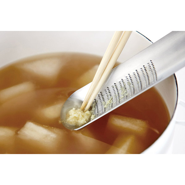 トレーのようなモダンデザインなので、そのままテーブルに出しても素敵です。ワサビやしょうがなどの薬味を卓上ですりおろし、新鮮なまま料理に添えることができます。周囲にカーブをつけたトレー形状でこぼれにくく、汁物などには薬味を溶かしながら入れることができます。