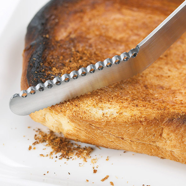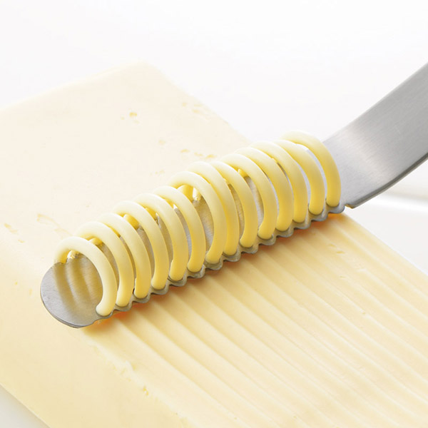 バターが中々溶けなくて塗りづらい…そんなお悩みを解決してくれるバターナイフ。斜めに開いた小さな穴が固いバターを糸状に削り、ふんわりと塗ることができます。持ち手と刃部が一体成形で作られているので丈夫です。