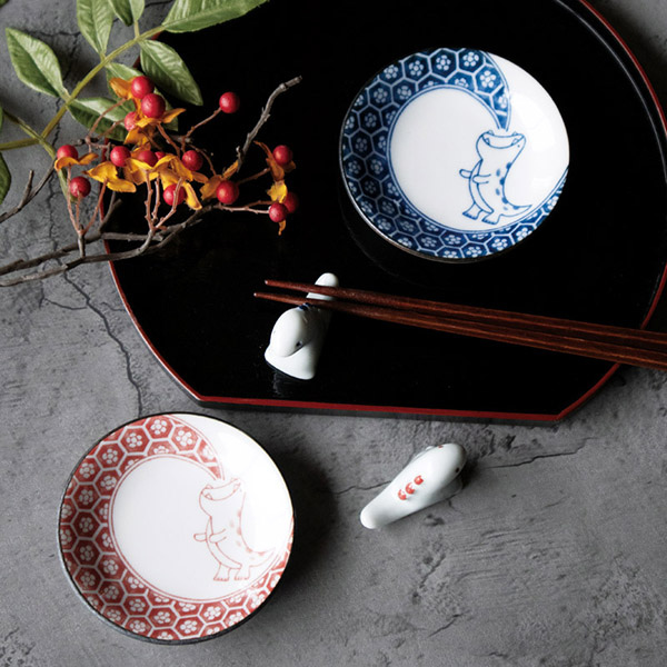 幸福が訪れる前ぶれの柄とされる祥瑞文様をあしらった、恐竜が幸福を届けてくれそうな可愛らしいデザインのまめ皿と箸置きのペアセットです。恐竜が火を噴いているようなデザインになっていて、思わずクスッとしてしまう微笑ましいアイテム。お子さまにも喜ばれる商品です。