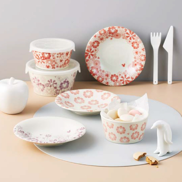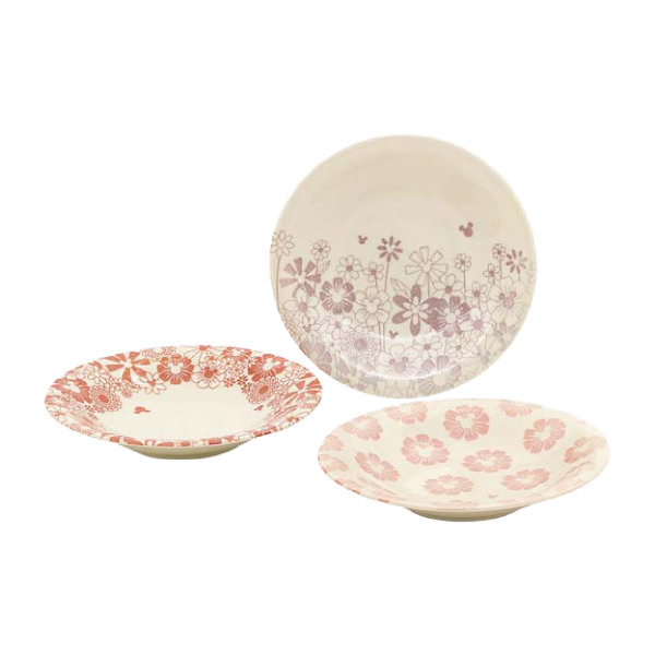花芯にミッキーマウスのアイコンをあしらったお花が、器いっぱいに咲き誇るガーリーでモダンなデザインテーブルウェア。