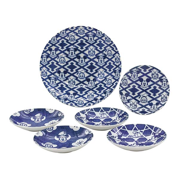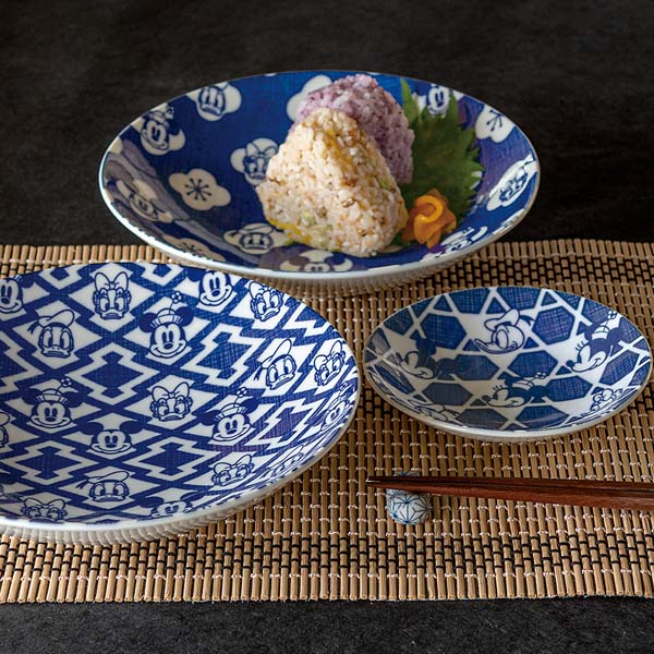 ミッキーマウスと仲間たちのすました表情のフェイスアートを、松皮菱、破れ籠目、黄梅といった日本の伝統的な和柄と組み合わせたデザインの器。