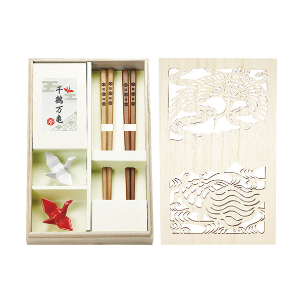 鶴と亀の縁起の良いデザインが魅力の紅白箸・箸置ペア。夫婦円満や金運上昇の象徴として華やかさを添え、日常の食卓を上品に演出します。特別な贈り物としても喜ばれる、上質感あふれるセットです。