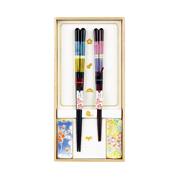 幸せな食卓を思い浮かべながら揃いのお箸と雰囲気を合わせた箸置のセットを一双オリジナルの桐箱に入れました。