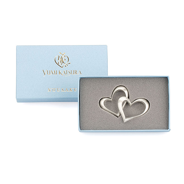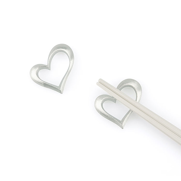 能作と、日本が世界に誇るブライダルファッションブランド『Yumi Katsura』がコラボレーションしました。ハートをモチーフにした錫100%の箸置きは重ねることができ、重なった形は二人が寄り添い合う「つながり」「絆」をイメージしています。錫は錆びにくく、朽ちにくいため、縁起のよいとされる金属。抗菌作用があり、食器としても安心してお使いいただけます。