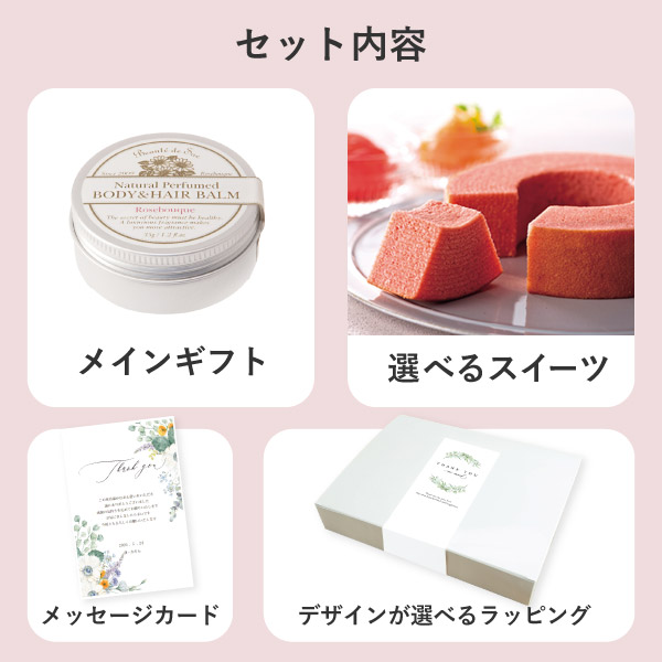 専用ボックスシールがおしゃれ!ちょっとしたお礼ギフトや結婚の内祝いのギフトにおすすめのギフトセットです。人気のスキンケアアイテムをはじめとする人気ギフトと選べるスイーツ、そしてオリジナルのメッセージカードをセットにしたギフトです。