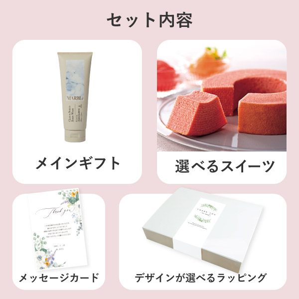 専用ボックスシールがおしゃれ!ちょっとしたお礼ギフトや結婚の内祝いのギフトにおすすめのギフトセットです。人気のスキンケアアイテムをはじめとする人気ギフトと選べるスイーツ、そしてオリジナルのメッセージカードをセットにしたギフトです。