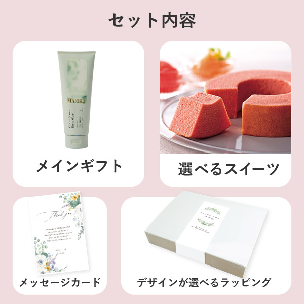 専用ボックスシールがおしゃれ!ちょっとしたお礼ギフトや結婚の内祝いのギフトにおすすめのギフトセットです。人気のスキンケアアイテムをはじめとする人気ギフトと選べるスイーツ、そしてオリジナルのメッセージカードをセットにしたギフトです。