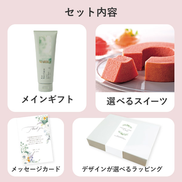 専用ボックスシールがおしゃれ!ちょっとしたお礼ギフトや結婚の内祝いのギフトにおすすめのギフトセットです。人気のスキンケアアイテムをはじめとする人気ギフトと選べるスイーツ、そしてオリジナルのメッセージカードをセットにしたギフトです。