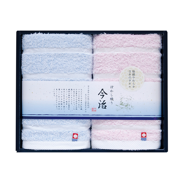 40単糸パイルでふんわり柔らかな「今治ぼかし織りII」タオルセット。淡い色合いが織り込まれたぼかし模様と細番手ならではの肌触りで、上質な風合いを楽しめる贈り物に最適な一枚です。