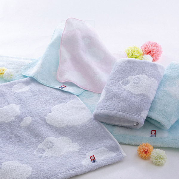 まるで雲のような、ふんわりとした柔らかさが特徴のタオルです。糸の撚りをゆるく「甘撚り」した、通常の糸より柔らかい糸で織り上げています。かわいらしいひつじの柄をあしらい、やさしい色合いに仕上げました。