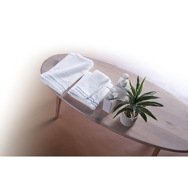なめらかな肌触りでふわっと軽くて使いやすい。シルクのような艶のある高級な綿のピマコットンをパイル全面に使用した贅沢なタオルです。月明かりのような上品な輝きがあるタオルに、部屋を明るくする青い色糸と上品な柄をあしらいました。