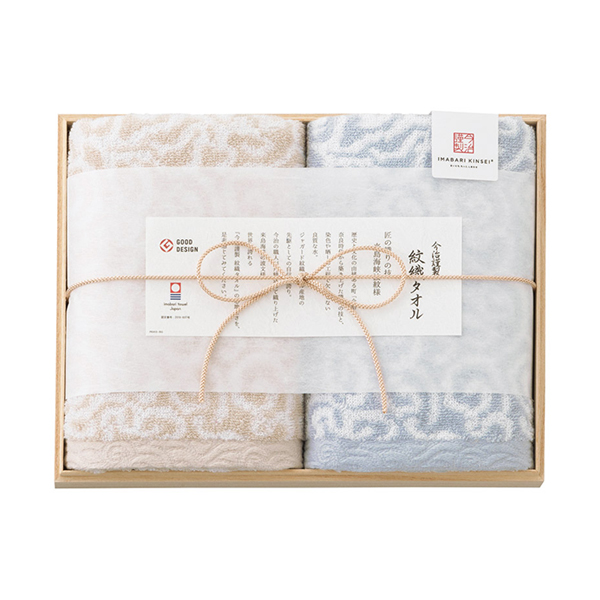 日本の伝統的な模様である唐草模様と来島海峡の荒波をイメージした波模様から着想を得た、手描きの不規則な曲線を美しく表現したタオルギフト。厳選された2種類のパイル糸を使い、ふっくらとやわらかいタオルになっています。品格を感じる木箱に入ったギフトです。