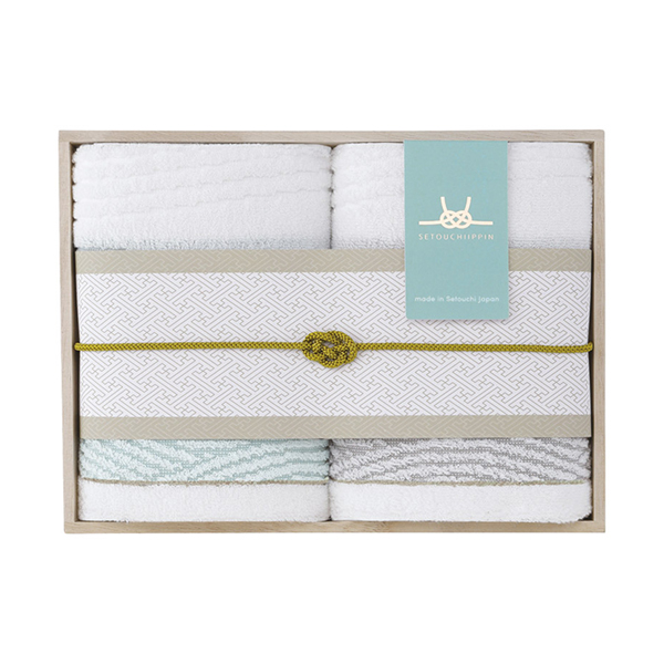 愛媛県今治産「瀬戸内逸品」のフェイスタオル2枚セット。瀬戸内海をイメージした上品なデザインで、木箱入りのためギフトに最適です。贈る方に高級感と心地よい肌触りを届け、特別な日の贈り物としても喜ばれる逸品です。