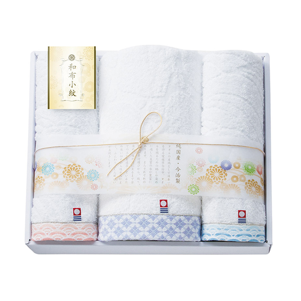 日本の伝統模様である小紋柄を可愛らしくあしらったふんわりタオルです。淡いカラーと和の美しさをシンプルに表現したデザインで日常使いしやすいアイテム。格調高い木箱に入れてお届けします。目上の方へのプレゼントにもおすすめです。