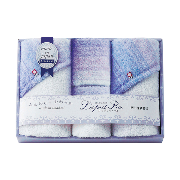 L'esprit Pur(レスプリピュール)とはフランス語で「きよらかなこころ」を意味します。純真な想いからくる、清らかなこころのイメージを清楚なパープルグラデーションを使ってふんわりとやわらかなタオルギフトにしました。