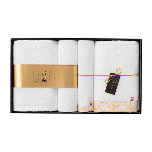 日本を代表するタオル産地の魅力を楽しめるタオルセット。やわらかく吸水性に優れた甘撚り糸の泉州タオルと、心地よい純白の今治タオルを組み合わせました。使い比べも楽しめる、贈り物に最適な上質ギフトです。