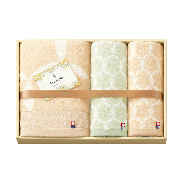 セルクルは、フランス語で「円」を意味します。人とのつながり”縁”と「円」をかけ合わせ、繋がりながら広がってゆく様を今治産地の特徴でもあるジャカード織で表現しました。落ち着いたグリーンとあたたかみのあるベージュの色の組み合わせはどなたにも喜んでいただけます。