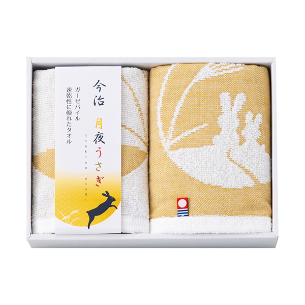 月夜に浮かぶ「うさぎ」をガーゼ織ジャガードで表現した今治タオルセット。吸水・速乾性に優れ、やさしい肌触りで毎日使いやすく、感謝の気持ちを込めた贈り物に最適です。