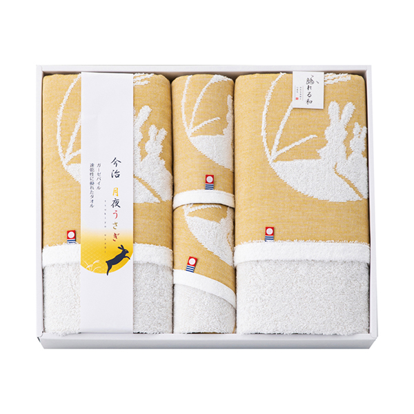 月夜に浮かぶ「うさぎ」をガーゼ織ジャガードで表現した今治タオルセット。吸水・速乾性に優れ、やさしい肌触りで毎日使いやすく、感謝の気持ちを込めた贈り物に最適です。