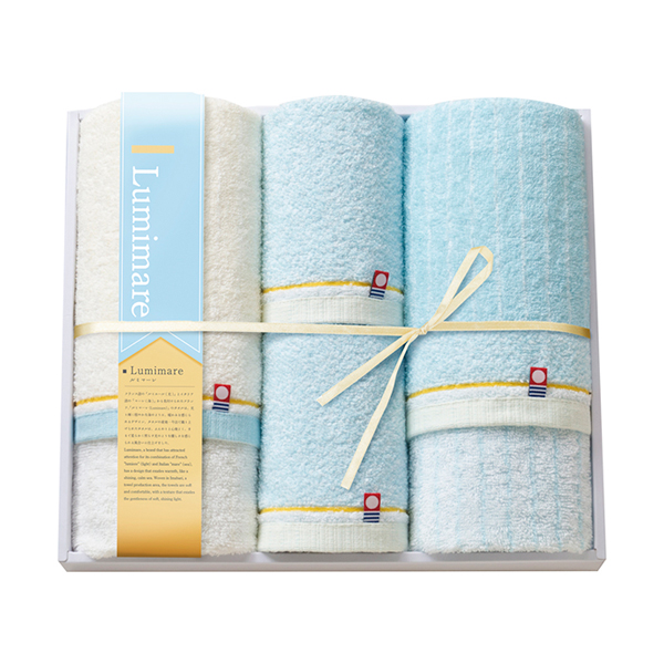 「ルミマーレ」タオルセットは、光と海をイメージした柔らかな風合いが魅力。ふんわり心地よく、まるで光に包まれるような優しさを感じられるタオルで、日常をやさしく彩る上質な贈り物に最適です。
