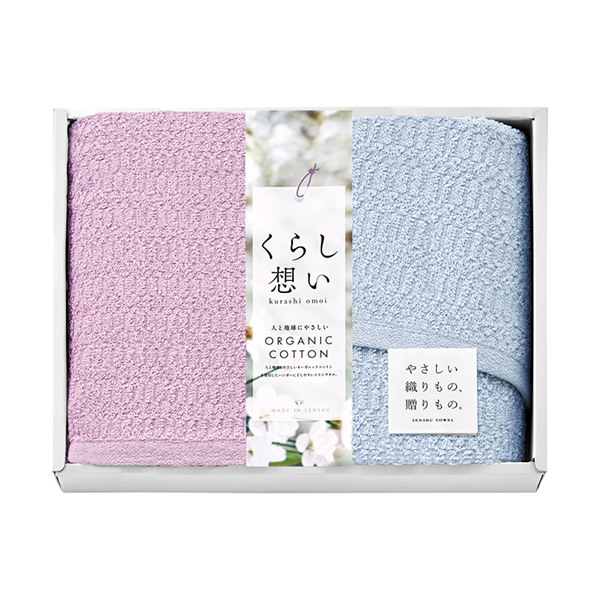 大阪泉州で織り上げた「くらし想い オーガニックコットン」タオルセット。スリムで干しやすく、収納や洗濯も便利。コンパクトでも肌触りは抜群で、日常にやさしさを添える使いやすいタオルギフトです。