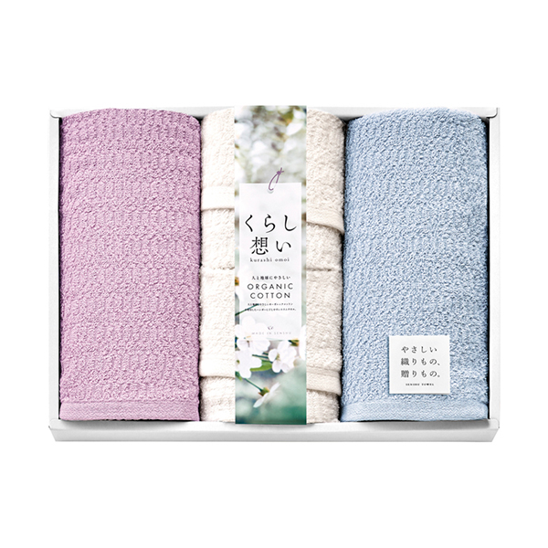 大阪泉州で織り上げた「くらし想い オーガニックコットン」タオルセット。スリムで干しやすく、収納や洗濯も便利。コンパクトでも肌触りは抜群で、日常にやさしさを添える使いやすいタオルギフトです。