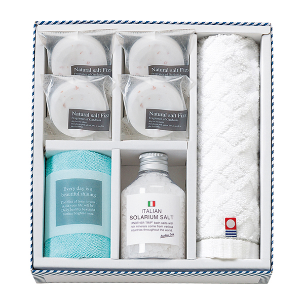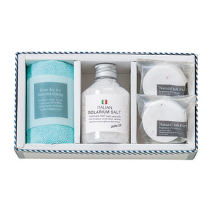 | 内容 | バスソルト(イタリア)180g・マイクロファイバークロス:25×25cm・今治ウォッシュタオル:28×30cm×各1、ソルト・フィズ40g×4 |