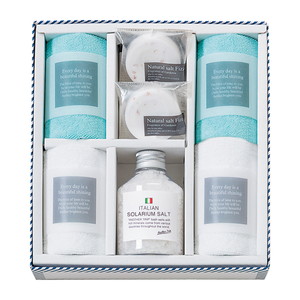 | 材質 | バスソルト:イタリア海塩、マイクロファイバークロス:ポリエステル80%・ナイロン20%、今治ウォッシュタオル:綿100% |