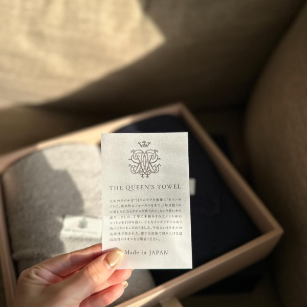 『THE QUEEN'S TOWEL』は、素材から色・パッケージまで一切妥協なくこだわり抜き、"上質"と"心地よさ"を追求した大人のためのプレミアムタオルです。「日々使うものだからこそ、触れたときの幸福感や満足感を楽しめるようなタオルを作りたい」そんな想いから生まれた『THE QUEEN'S TOWEL』。王妃のタオルとも呼ばれるそのタオルは、思わず顔をうずめたくなるようなやわらかい肌触り。日常の中で何気なく触れた瞬間ほっと安らぐような幸せと充実感を届けてくれます。タオルの名産地、今治で生まれたタオルならではの高い吸水性を持ち、その実力はドライヤーの時間を短縮させるほど。