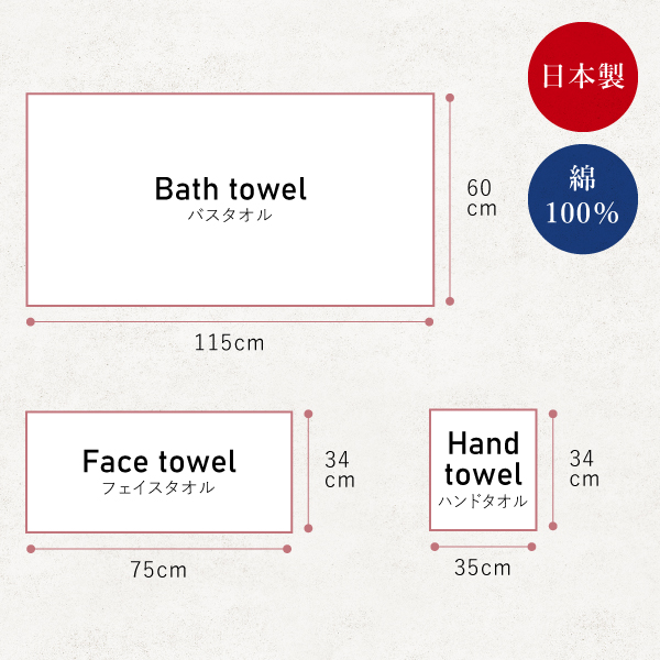 | 内容 | バスタオル(60×115cm)・フェイスタオル(34×75cm)・ハンドタオル(34×30cm) |
