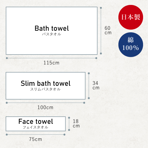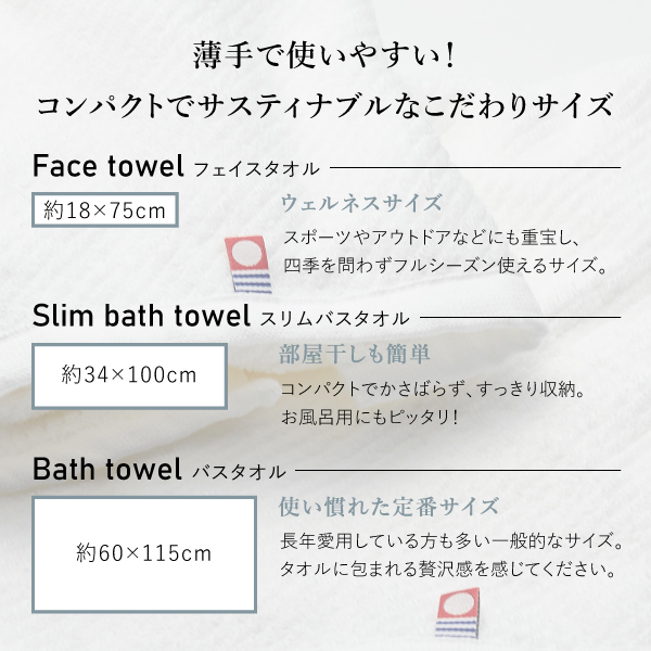 | 内容 | バスタオル2P(60×115cm)・スリムバスタオル2P(34×100cm)・フェイスタオル(18×75cm) |