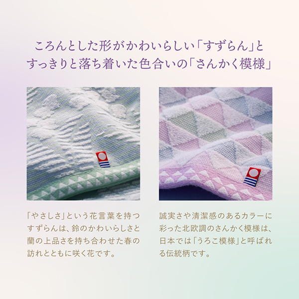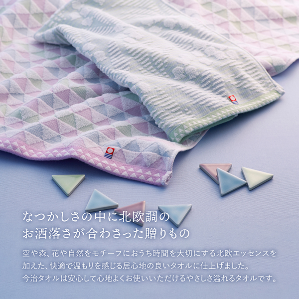 ころんとした形がかわいらしい「すずらん」と、色とりどりの「さんかく模様」を組み合わせた、なつかしさの中に北欧のお洒落さが合わさった今治タオルギフトです。空や森の色、花や自然をモチーフにおうち時間を大切にする北欧のエッセンスを加えた、快適で温もりを感じる居心地の良いタオルに仕上げました。