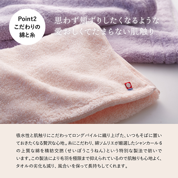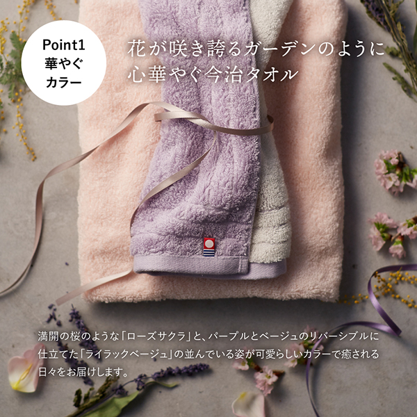 花が咲き誇るガーデンのように心を華やかにしてくれるようなふわっふわの今治タオル。満開の桜のような「ローズサクラ」と、パープルとベージュのリバーシブルに仕立てた「ライラックベージュ」の並んでる姿がかわいらしいカラーで、優しく癒される日々をお届けします。思わず頬ずりしたくなるような、愛おしくてたまらないふわっふわな肌触り。吸水性と肌触りにこだわってロングパイルに織り上げた、いつもそばに置いておきたくなる贅沢な心地です。