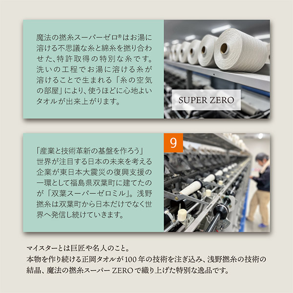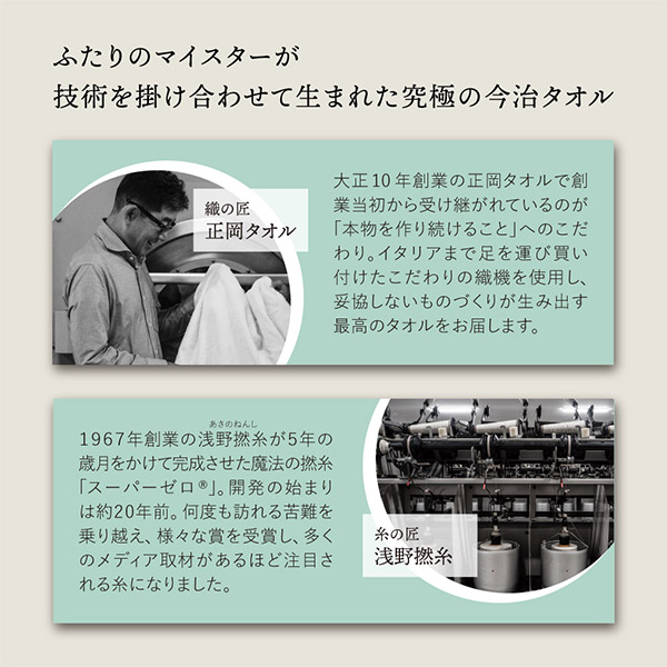 本物を作り続ける正岡タオルが100年の技術を注ぎ込み、浅野撚糸の技術の結晶、魔法の撚糸スーパーゼロで織り上げた特別な逸品です。白のシンプルなタオルは年齢や性別を問わず贈りやすいことからギフトでも人気。マイスターが生み出すこだわり抜いた白いタオルは、贈る相手の方に心地良く使っていただけるおすすめのギフトです。