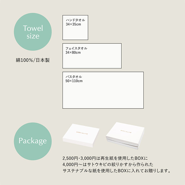 | 内容 | フェイスタオル(34×80cm)・ハンドタオル(34×35cm) |
