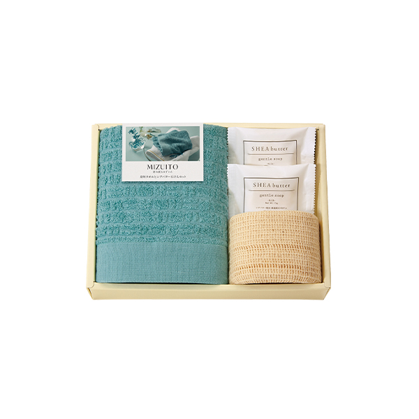 【41%OFF】MIZUITO 澄みわたるみずいと 泉州タオルとシアバター石けんセット フェイスタオル1P・綿ボディタオル1P・石けん2P|内祝い・お返しギフトならPIARY(ピアリー)