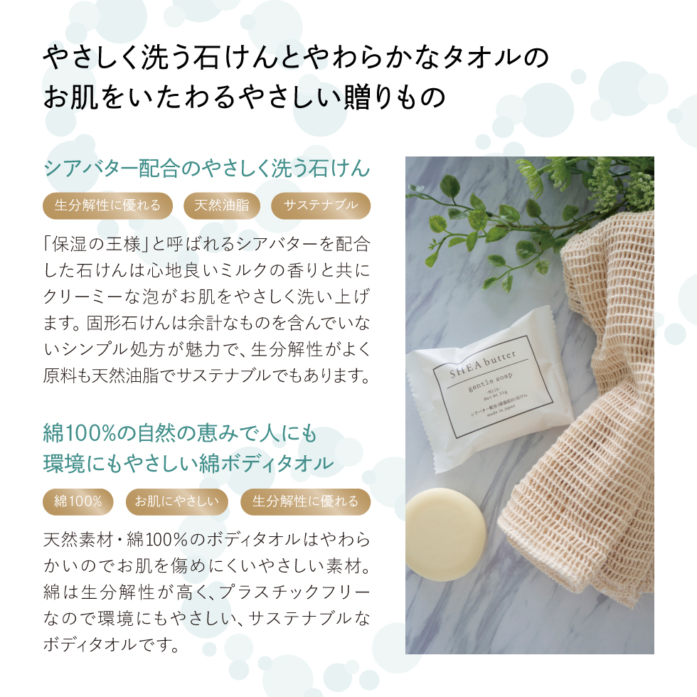 ふんわりとした泉州タオルにシアバター配合のやさしく洗う石けんと、お肌にやさしいフェイスタオル・ハンドタオル・綿ボディタオルをセットにしました。