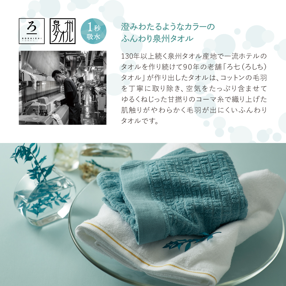 大阪「泉州」で130年以上も続く泉州タオル。和泉山脈の豊富な地下水を使い、伝統的な製法によって作られる高品質なタオルとして知られています。清潔で吸水性がよく、やわらかな肌当たりは普段使いに最適。澄み渡るような色づくりと甘撚りのコーマ糸で織りあげたふんわり心地のタオルは、実用性が高くどなたにも喜んでいただけます。