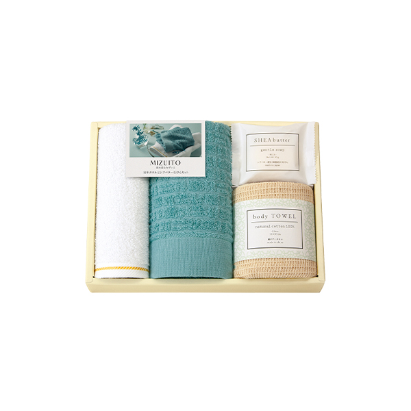 【43%OFF】MIZUITO 澄みわたるみずいと 泉州タオルとシアバター石けんセット フェイスタオル1P・ハンドタオル1P・綿ボディタオル1P・石けん1P|内祝い・お返しギフトならPIARY(ピアリー)