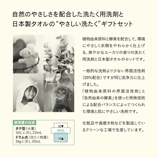 自然のやさしさを配合した植物由来原料使用の爽やかな香りの洗たく用洗剤と日本製タオルギフトセットです。洗たく用洗剤は植物由来原料と酵素を配合しているため環境にやさしく衣類をやわらかく仕上げます。毎日使うタオルと洗剤のセットは、性別問わず喜ばれます。