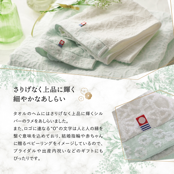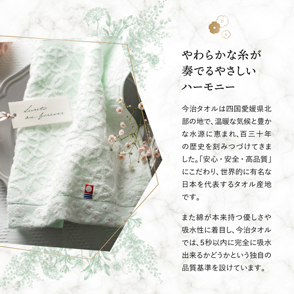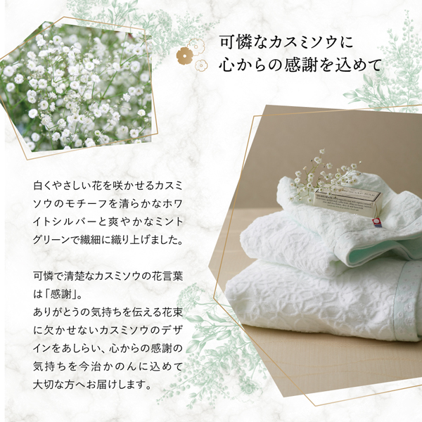 やわらかな糸が奏でるカスミソウと今治タオルのやさしいハーモニー。「感謝」という花言葉をもつカスミソウをモチーフに繊細なレース柄を織り上げた爽やかなグリーンとホワイトの今治タオルです。