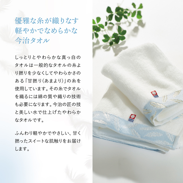 今治の技と美しい水で仕上げた、やわらかいタオルです。