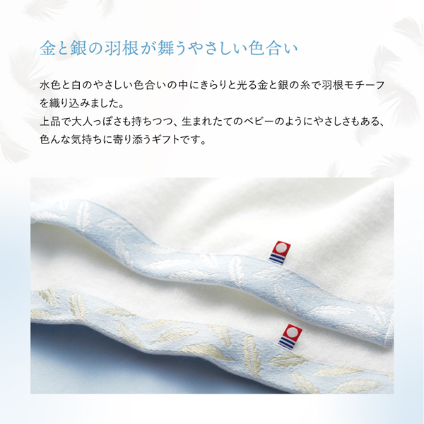 ラッキーモチーフである天使の羽根をキラキラの金と銀の糸で織り込んだやわらかくスイートな肌触り。しっとり柔らかで真っ白なタオルは、一般的なタオルの糸より撚りを少なくして柔らかさのある「甘撚り」の糸を使っています。